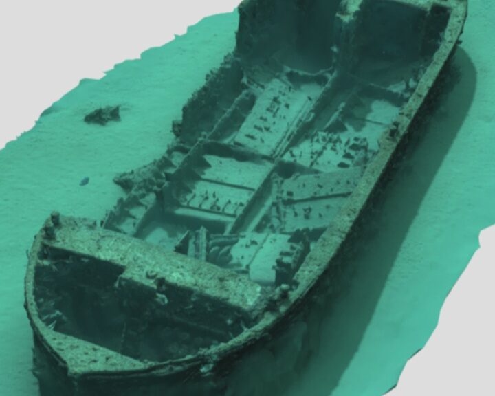 Vue en date de décembre 2025 en 3D de l’arrière du jungingen M534 de la Kriegsmarine, escorteur de ramboot, coulé le 27 septembre 1943 en même temps que le H7 Madali par le MTB 231 hollandais L’épave est en 2 morceaux, celui ci représente l’arrière qui repose à 30M de fond en face de Merlimont dans la zone dite du convoi. Vraisemblablement un troisième existe mais n’a pas encore été retrouvé. L’épave a été définitivement identifié en 2022. Photogrammétrie réalisée…