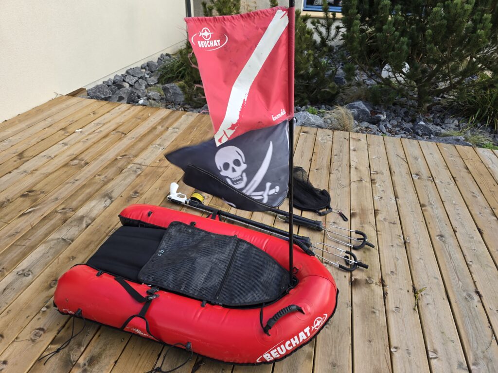 Au niveau du matériel, un moyen de signalisation est obligatoire, une bouée avec drapeau. Dans mon cas, j’utilise une planche assez imposante, la Beuchat “guardian” qui permet d’être bien visible et de limiter les risques lors des belles journées. Elle présente l’avantage de pouvoir mettre les poissons à l’intérieur car chez nous, pas question de mettre les poissons sous la planche comme ailleurs. Les phoques veillent au grain et la sanction est immédiate.