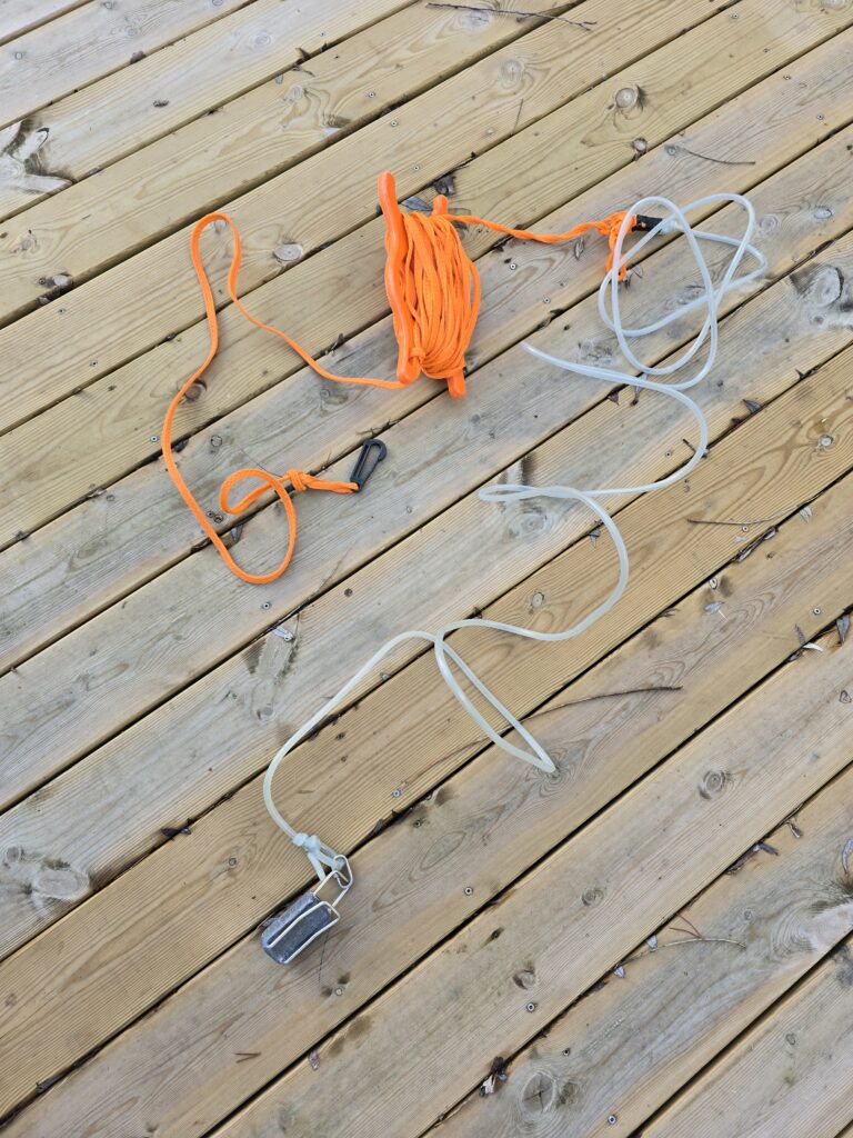 Le second élément de sécurité est la ligne qui vous relie à la planche. Il faut pouvoir la larguer facilement, qu’elle ne s’emmêle pas dans vos palmes et qu’elle ne s’accroche pas aux rochers durant l’apnée. J’ai mis un peu de temps à trouver le bon setup, mais celui que j’utilise actuellement me donne entière satisfaction depuis plusieurs années. Il est différent de ce que l’on utilise dans le sud, où l’on cherche la discrétion, ici la sécurité prime du fait du courant. J’utilise de la corde flottante orange de 8mm, terminé par 8m de tuyau d’aquarium en 8m également et un plomb largable de 750 gr.