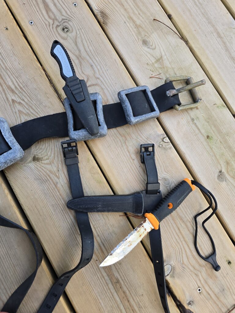 Autre élément de sécurité indispensable, le couteau ou plutôt les couteaux. La présence de filets, lignes de pêche rend cet équipement obligatoire, il servira aussi à achever le poisson. J’en utilise deux, un sur l’avant bras gauche, assez grand, très coupant et un second plus petit à la taille sur ma ceinture de plomb.